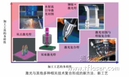就拿激光焊接技術(shù)來(lái)說,在激光復(fù)合工藝的發(fā)展中已出現(xiàn)了如雙點(diǎn)或雙束激光的復(fù)合、激光與電弧的復(fù)合、激光與攪拌摩擦熱復(fù)合以及激光與電阻熱復(fù)合等形式;并呈現(xiàn)與其他相關(guān)技術(shù)結(jié)合及功能延伸的趨勢(shì),如與水射流、鉚接等結(jié)合而形成的新工藝(見圖)。