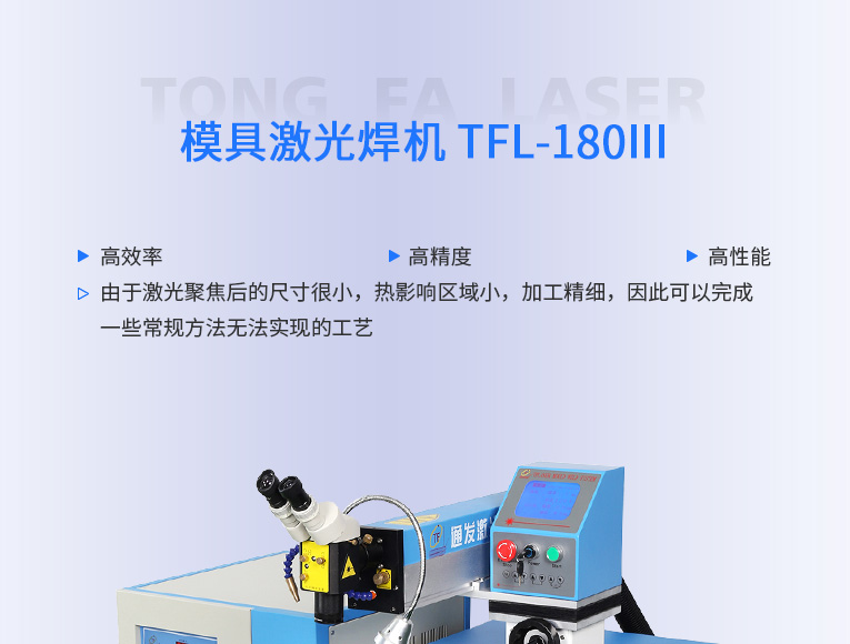普通型模具激光焊機TFL-180Ⅲ是通發(fā)激光公司的模具激光焊機中銷量較大的傳統(tǒng)型,配置激光頭手搖升降與工作臺按鈕電動升降實現(xiàn)焊接不同厚度模具的激光焊加工。本系列機型適用于各類精密注塑模具激光補焊、壓鑄模具激光修補焊接;同時也適合鑄件沙孔激光修補、模具磨損激光修復、過切加工等的激光修補;各類金屬結構件激光焊接加工、不銹鋼首飾激光焊接加工。