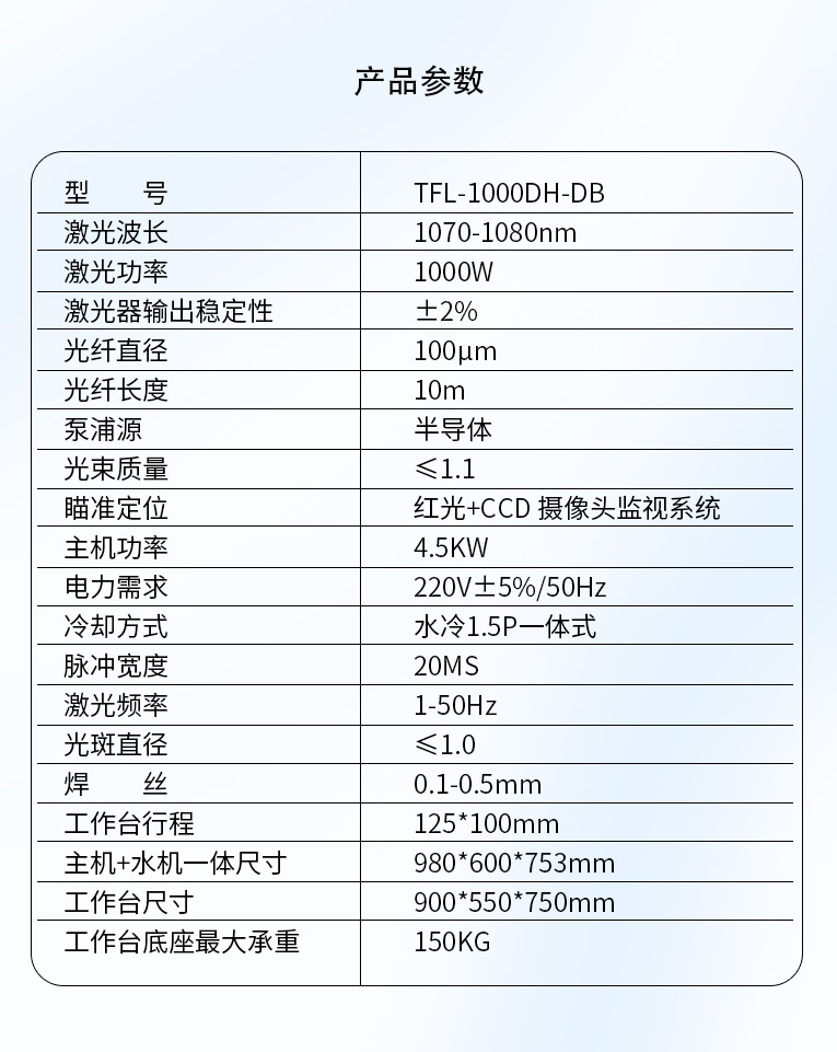 采用光纖激光器,反射率高,能量強,免維護,免調光,功耗少,相比傳統(tǒng) 模具焊來說,體積小,安全,穩(wěn)定性好超長使用壽命。 1000W光纖激光器,滿足銅、鋁焊接量大的模具及產品焊接加工需要。 高承重底座及工作臺,保持輕便靈活的優(yōu)點,同時提供更高承載能力。 配備.1.5P大功率一體式水冷水機,保證了大功率焊接的穩(wěn)定性。