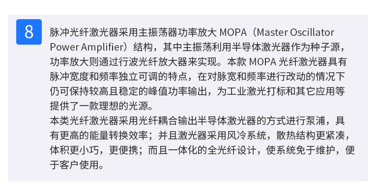 通發(fā)激光TFL-80SW振鏡激光焊接機(jī),采用主振蕩器功率放大 MOPA(Masrer Qscillator Power Amplifier)結(jié)構(gòu),實(shí)現(xiàn)脈沖寬度和頻率獨(dú)立可調(diào)的特點(diǎn),在對(duì)脈寬和頻率進(jìn)行改動(dòng)的情況下仍保持較高且穩(wěn)定的峰值功率輸出,適用于電池、小五金等多個(gè)行業(yè)的激光打標(biāo)、激光焊接應(yīng)用。